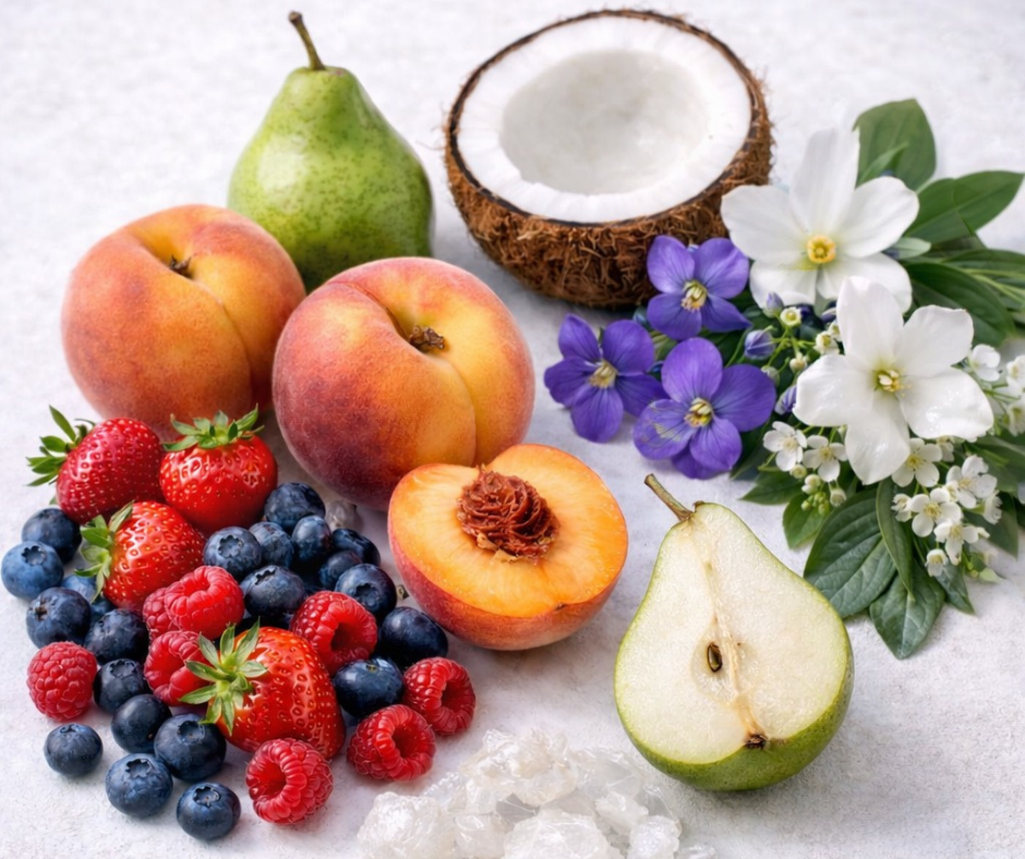 A radiant fruity-floral fragrance that opens with sparkling berries, peach, and creamy coconut. Soft violet and white florals unfold into a warm, elegant finish of musk and powdered sugar.